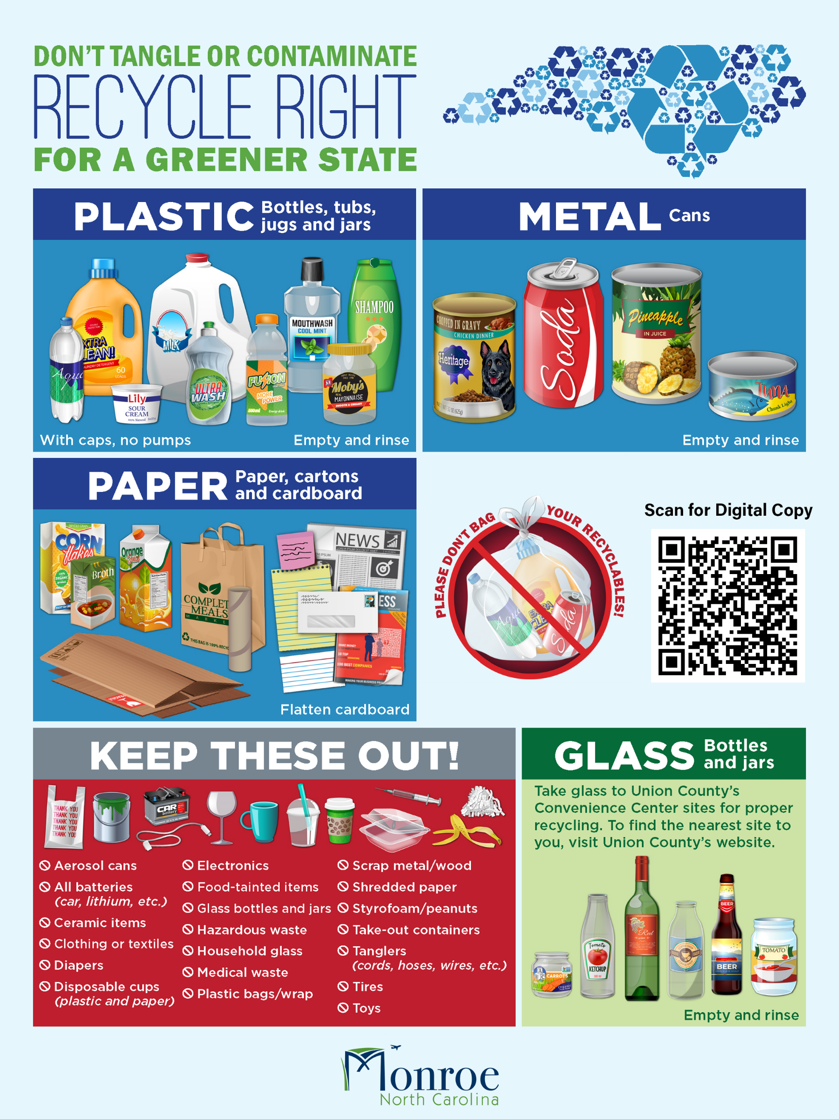 The City of Monroe provides recycling collection for our residents every other week on the same day as your garbage collection. Please use your 96-gallon black recycling cart only for the items we accept in our program. Items should be placed in your recycling cart loose and not contained in a plastic bag.