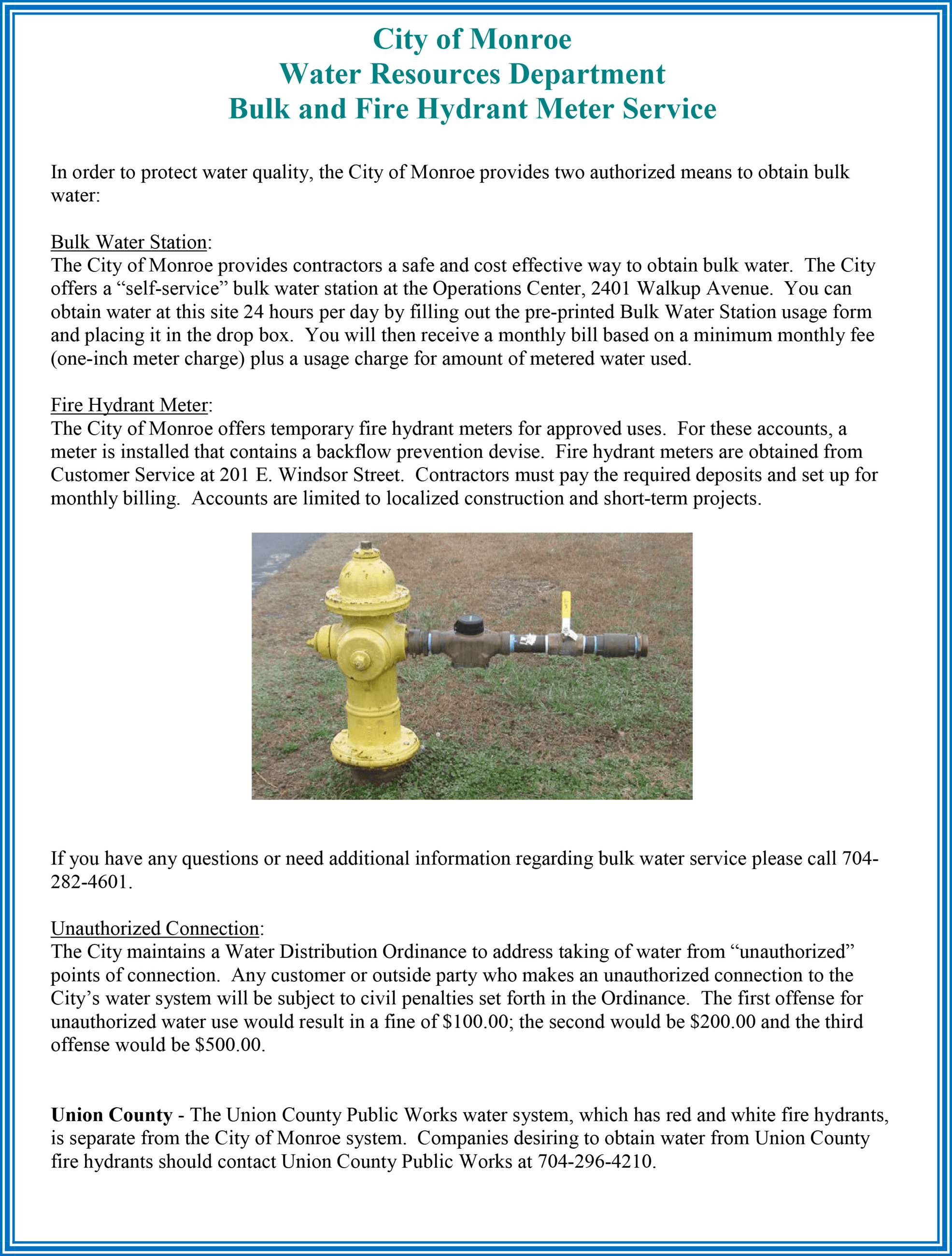 - To report water leaks, sewer blockages, or hydrant tampering, call 704-282-4601.